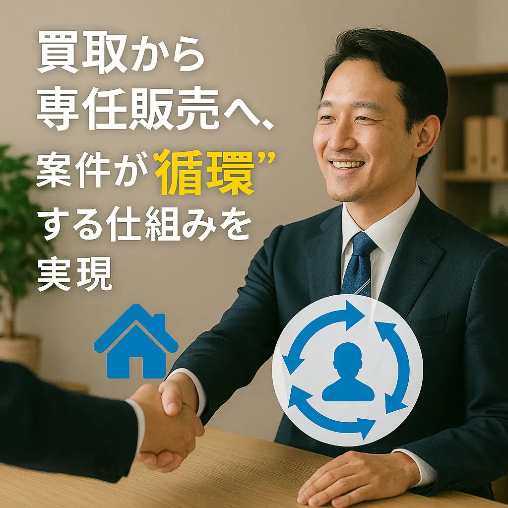 成約率・専任率を高める営業導線と、滞留物件を現金化する買取ルートを提供。「買取→専任販売」の連携で案件が循環し、地域内で利益を回す仕組みを作ります。