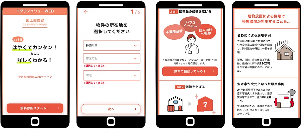 これらの課題を解決するため、WEB上で簡単な質問に答えるだけで、空き家の経済価値や利活用の可能性、危険性を示し、空き家に関わる様々なお悩みに対し最適なソリューションを行う窓口を紹介するサービスを開発しました。